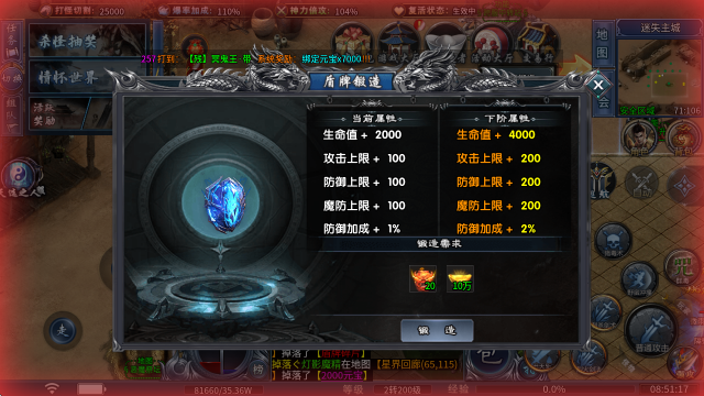 1、盾牌锻造:消耗盾牌碎片和元宝即可进行锻造,可以大幅提升你的防御属性。