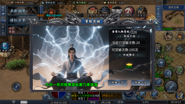 4、等级突破:花费元宝即可突破等级上限,十步一杀对低等级玩家几率冰冻。
